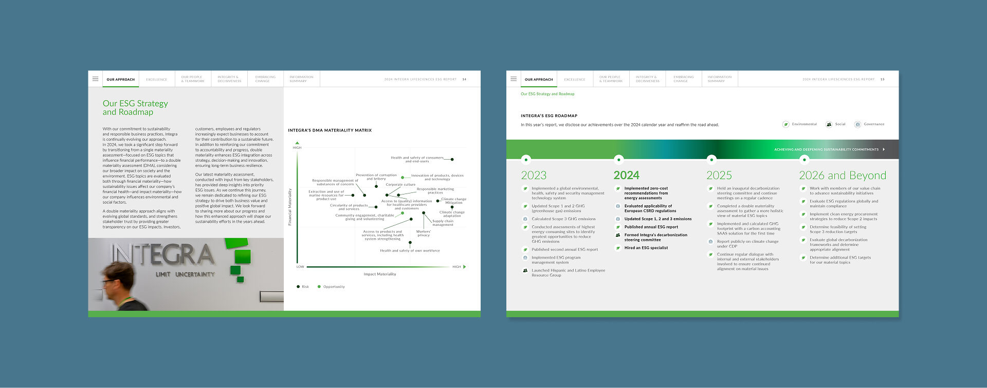 IOP designed the visually rich report to engage a range of audiences, both those seeking quick takeaways and those looking to dive deeper. The report uses a clear structure with color-coded sections, photography centered on both Integra’s people and products, custom icons, and callouts to guide the reader. Key infographics visualize complex ESG topics including Integra’s Growth Strategy and ESG Roadmap, ESG Governance Structure, and current and future reporting on Scope 1–3 emissions. The report reflects Integra’s commitment to transparency and accountability and is grounded in a double materiality assessment and aligned with both GRI and SASB reporting frameworks.